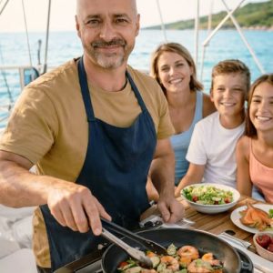Ko pride do hrane… tukaj se sprosti še zadnji košček napetosti. Ne rabiš razmišljati, kaj bo za jesti, kaj kdo ne je, kdo bo nabavil, kdo bo skuhal, postregel ali pospravil. Midva urediva vse. Zajtrk, kosilo, večerja – sveže pripravljeno, na krovu. Brez dogovarjanja kdo je na vrsti, brez iskanja gostiln, brez odločanja kaj bi jedli, brez “eh, to bi lahko jedel doma”. V času plovbe ti predstavim svoj kulinarični maksimum – u izi, ampak vrhunsko.